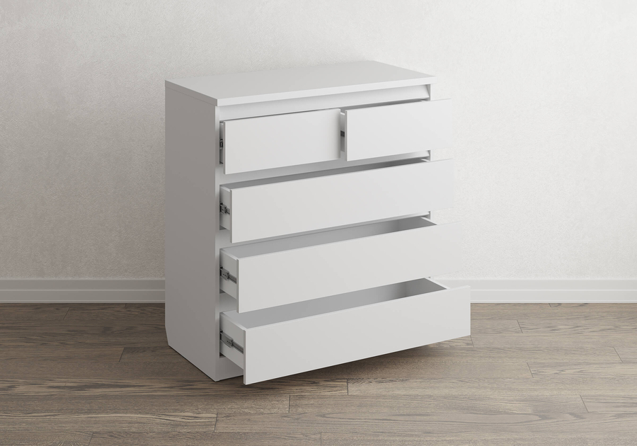 Aksel - комод без лишнего. Лаконичная скандинавская форма, четыре варианта цвета и скос под плинтус позволяют вписать его в любую комнату: спальню, гостиную, детскую или домашний кабинет и встать вплотную к стене без зазора. Надёжные шариковые направляющие обеспечивают плавное и лёгкое выдвижение ящиков без рывков и перекосов.