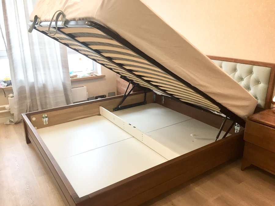 Кровать оснащена усиленным царговым поясом с механизмом трехуровневой высоты. Это позволяет регулировать глубину залегания матраса и подбирать комфортную высоту спального места. Дополнительно можно приобрести комплект донышек, чтобы создать вместительный бельевой ящик вместе с подъемным механизмом.